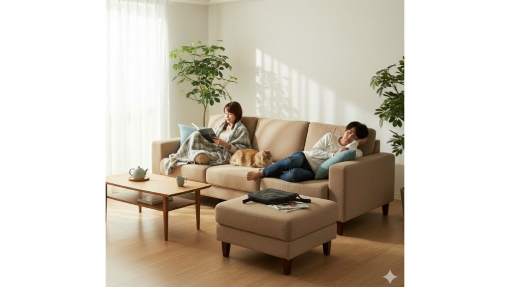 おすすめは、巨大なコーナーソファをドーンと置くのではなく、「3人掛けソファ+オットマン(足置き)」の組み合わせを選ぶことです。