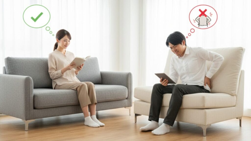 お店で座った瞬間「わぁ、ふかふか〜!」と感動して、勢いで柔らかいソファを買ってしまうと、後で後悔するかもしれません。実は、リビングで長時間過ごすなら「硬め」の方が体への負担は圧倒的に少ないのです。