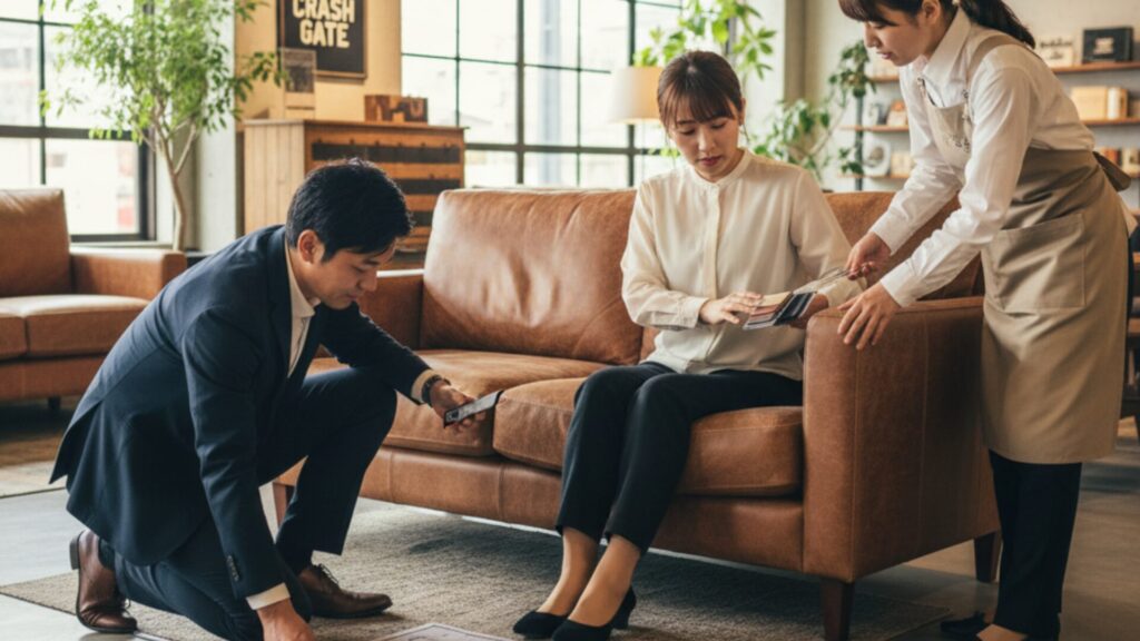 - リアルなサイズ感の体感:展示されているソファの周りをぐるりと歩き、実際の圧迫感や、他の家具との距離感、生活動線が確保できるかを具体的にイメージします。