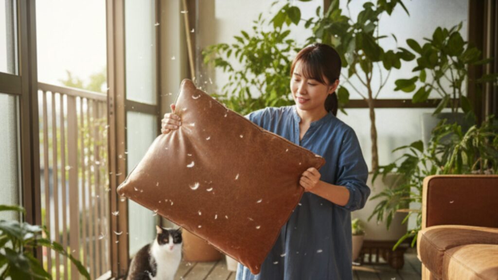 具体的には、天気の良い日にクッションをベランダなどで陰干しし、手でパンパンと力強く叩いて内部のフェザーにまんべんなく空気を含ませることで、驚くほどふっくらとしたボリュームを回復させることができます。