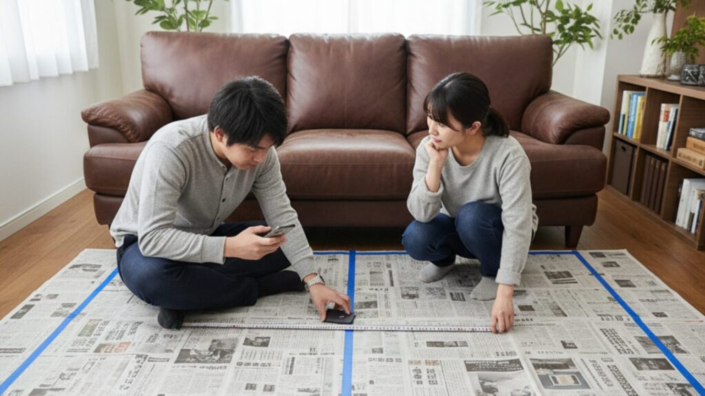 ソファのような大型家具で後悔しないためには、購入前に設置したい場所の寸法をメジャーで測るだけでなく、床に新聞紙やマスキングテープを使い、ソファの実寸サイズの枠を作ってみることを強くおすすめします。
