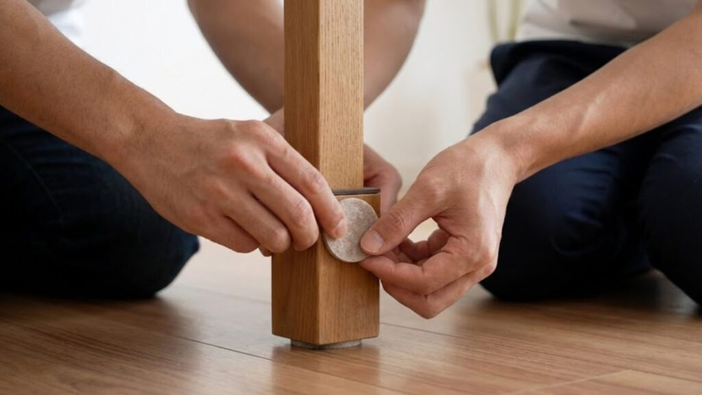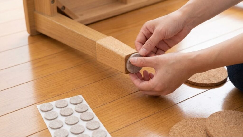 最も簡単で効果的なのは、ホームセンターや100均で売っている「家具用フェルト」を貼ることです。薄いフェルトではなく、厚みが3mm〜5mm程度あるしっかりとしたタイプを選ぶと、衝撃吸収性が高く、傷防止効果が長続きします。フェルトを貼ることでテーブルの滑りが良くなり、引きずった時の不快な音も防げます。