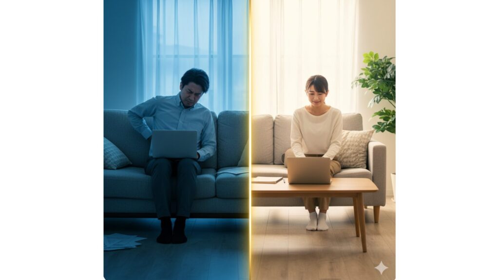 (ソファで快適に仕事をするための、テーブルとの最適な高さバランスについては、ソファとテーブルの最適バランス学:高さ・サイズ・レイアウトの黄金比の記事で詳しく解説しています)