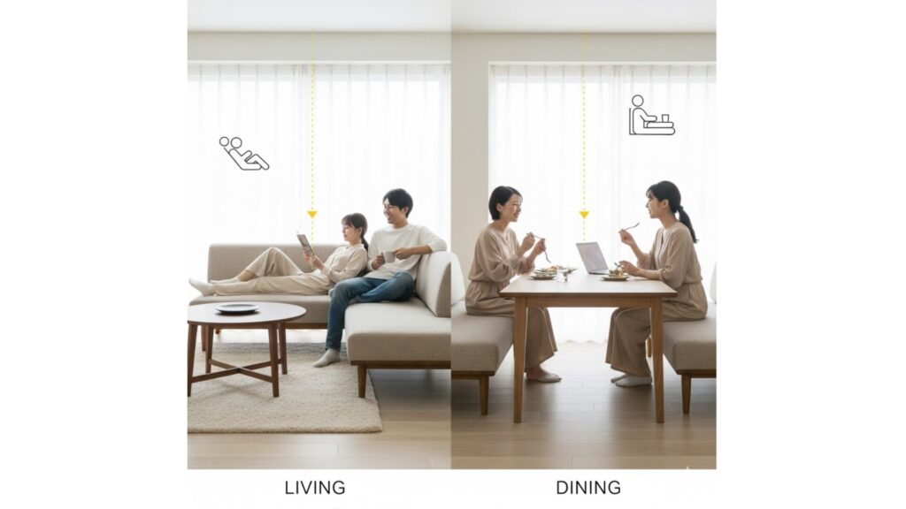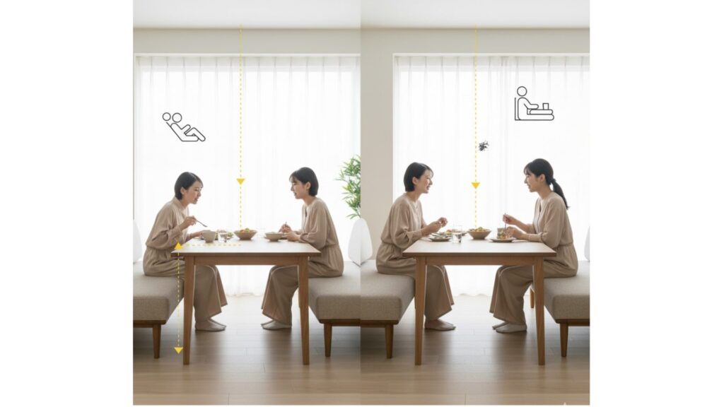 リビングでの「リラックス」を追求する高さと、ダイニングでの「食事・作業のしやすさ」を追求する高さは、人間工学的な根拠が異なります。ここでは、この2大シーンを明確に分けて、それぞれの「最適解」を探っていきましょう。